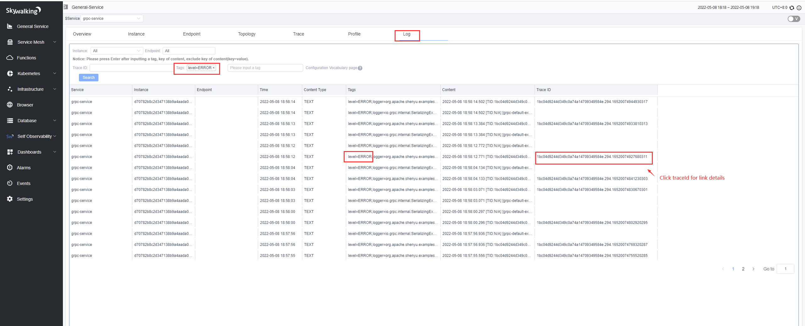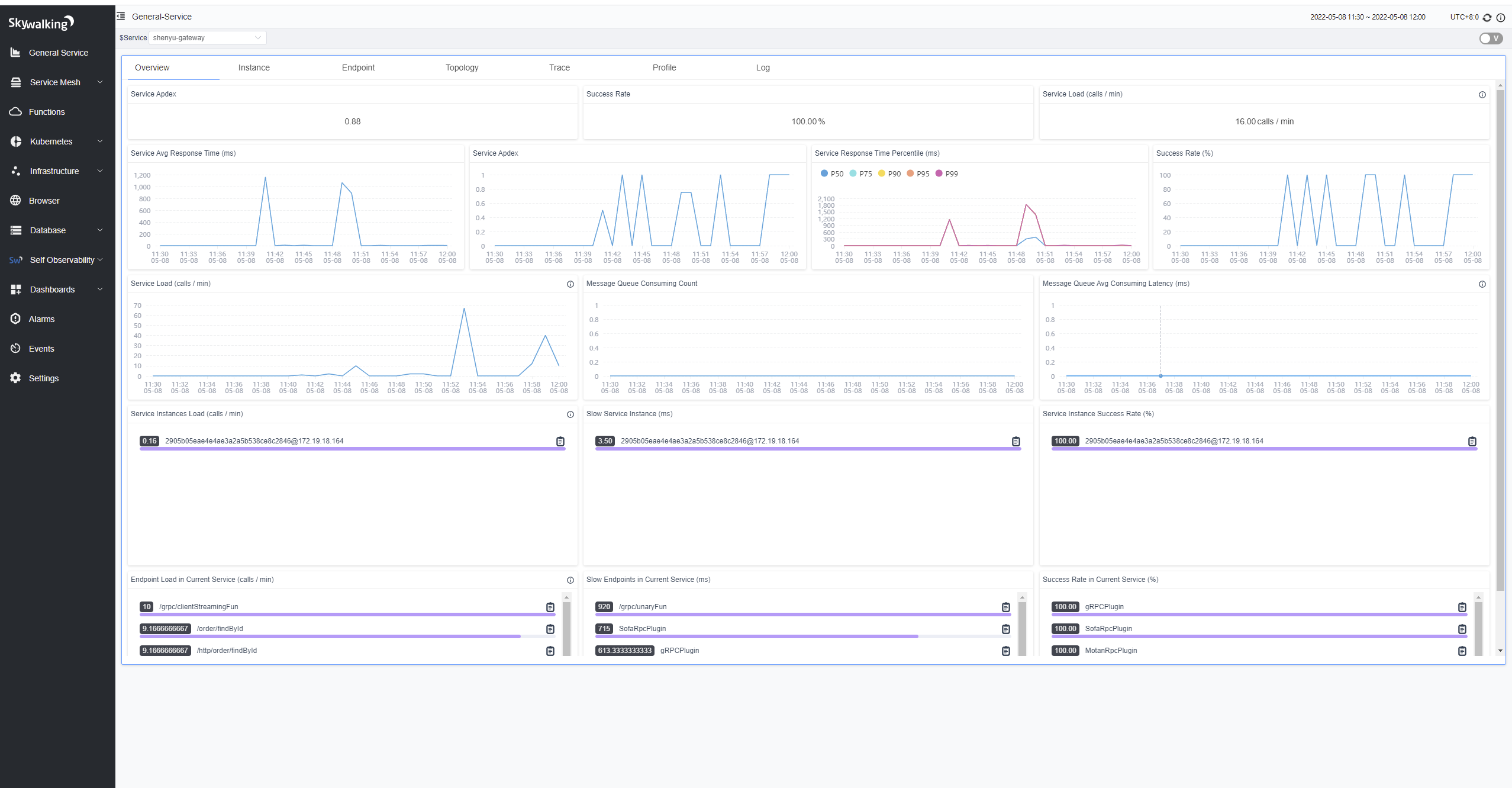 Here only describe the link tracking and application performance analysis part, if you want to experience the power of SkyWalking features, please refer to the SkyWalking official documentation.