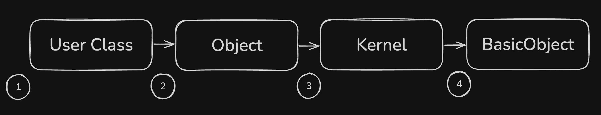 prepend will insert at position 1 in the above figure. Ruby first looks for the brave method in the Dapper module, finds it, and calls it. If the brave method is not found in Dapper, Ruby continues to search in the User class. If it is not found in the User class, Ruby continues to search in Object, and so on.